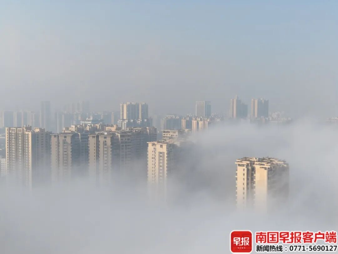 2月14日,南宁秒变云中仙境,在阳光照射下,高楼若隐若现,如同海市蜃楼。