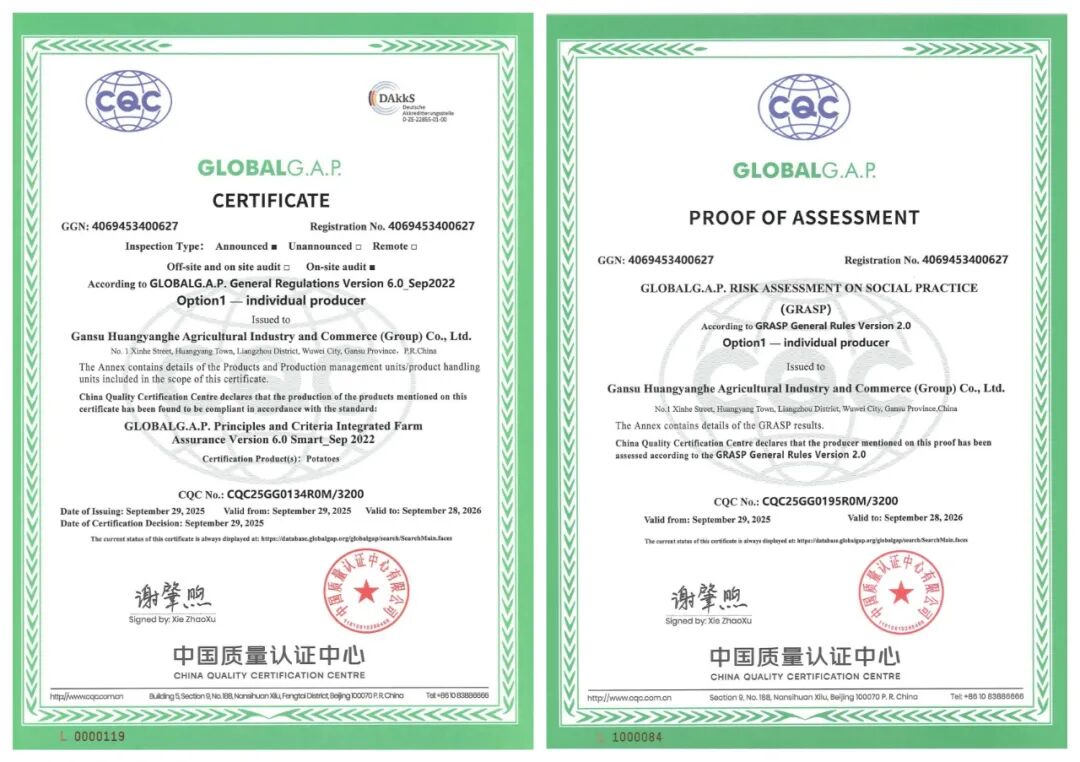 近日,黄羊河集团公司成功获得由中国质量认证中心颁发的全球良好农业规范(GLOBALG.A.P.)认证证书及社会实践风险评估(GRASP)证明。